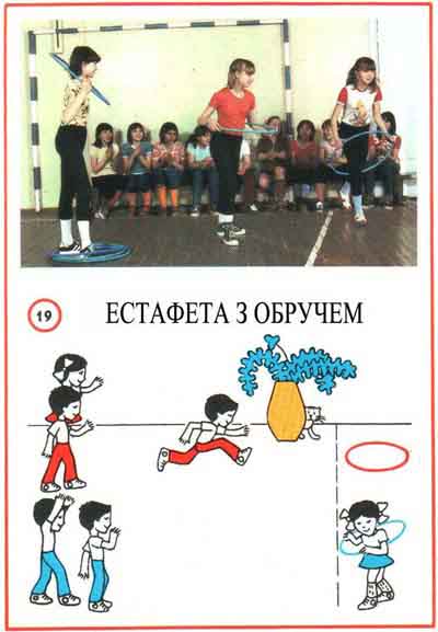 Можна провести естафету. У 10—15 метрах перед кожною шеренгою лежать обручі, Завдання кожного гравця добігти до обруча, підняти його, протягнути через себе і повернутися назад, торкнувшись рукою наступного. Виграє команда, що виконала вправу швидше.