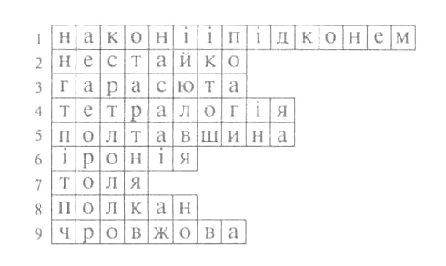 Відповіді: 1. «На коні і під конем». 2. Нестайко. 3. Гарасюта. 4. Тетралогія. 5.Полтавщина. 6. Іронія. 7. Толя. 8. Полкан. 9. Чровжова.